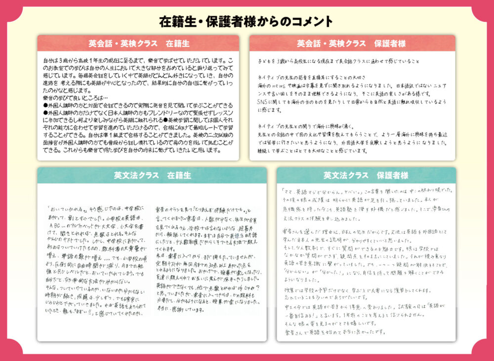 2026年2月9日 / 最終更新日 : 2026年2月9日 gakune お知らせ 在籍生と保護者さまよりコメントをいただきました 当教室在籍生と保護者さまよりコメントをいただきました コメントを残す コメントをキャンセルメールアドレスが公開されることはありません。 ※ が付いている欄は必須項目ですコメント ※ 名前 ※ メール ※ サイト 次回のコメントで使用するためブラウザーに自分の名前、メールアドレス、サイトを保存する。