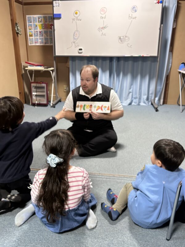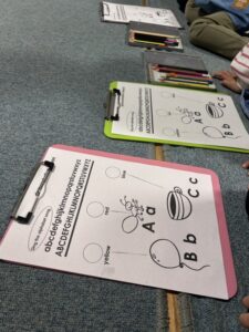 レッスンでは 歌 ダンス 色ぬり 絵本の読み聞かせ Aa Bb Cc のフォニックス その文字が出てくる単語 ant balloon cup など…